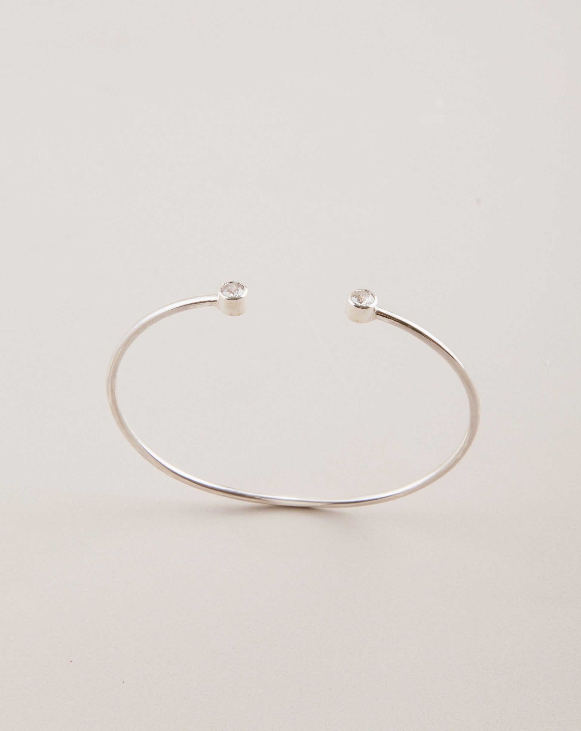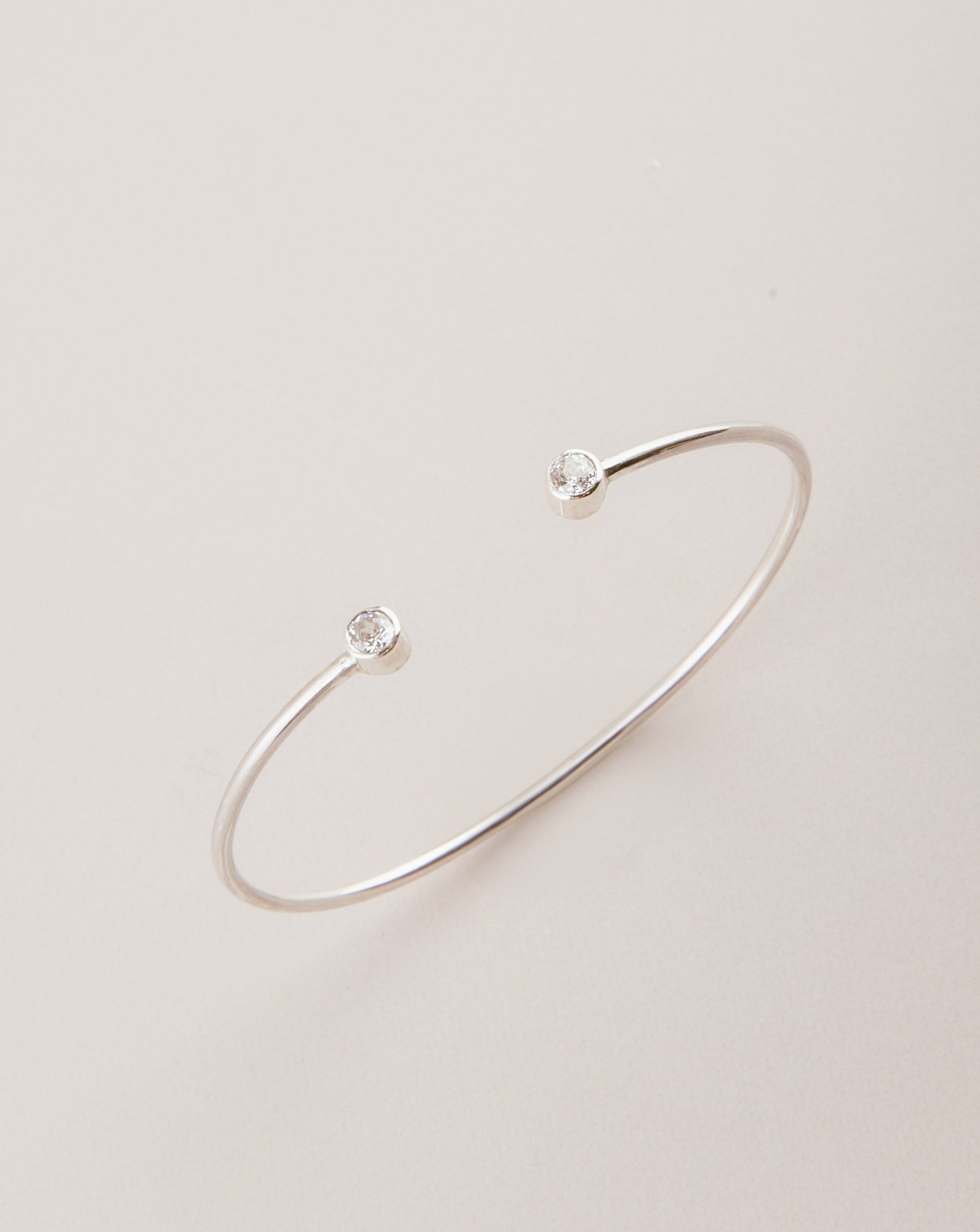 Elegancia sencilla para tu estilo con nuestro brazalete de plata con abertura y dos circones en cada extremo. Este diseño minimalista y versátil se caracteriza por su simpleza y adaptabilidad, convirtiéndose en una pieza esencial para cualquier ocasión.