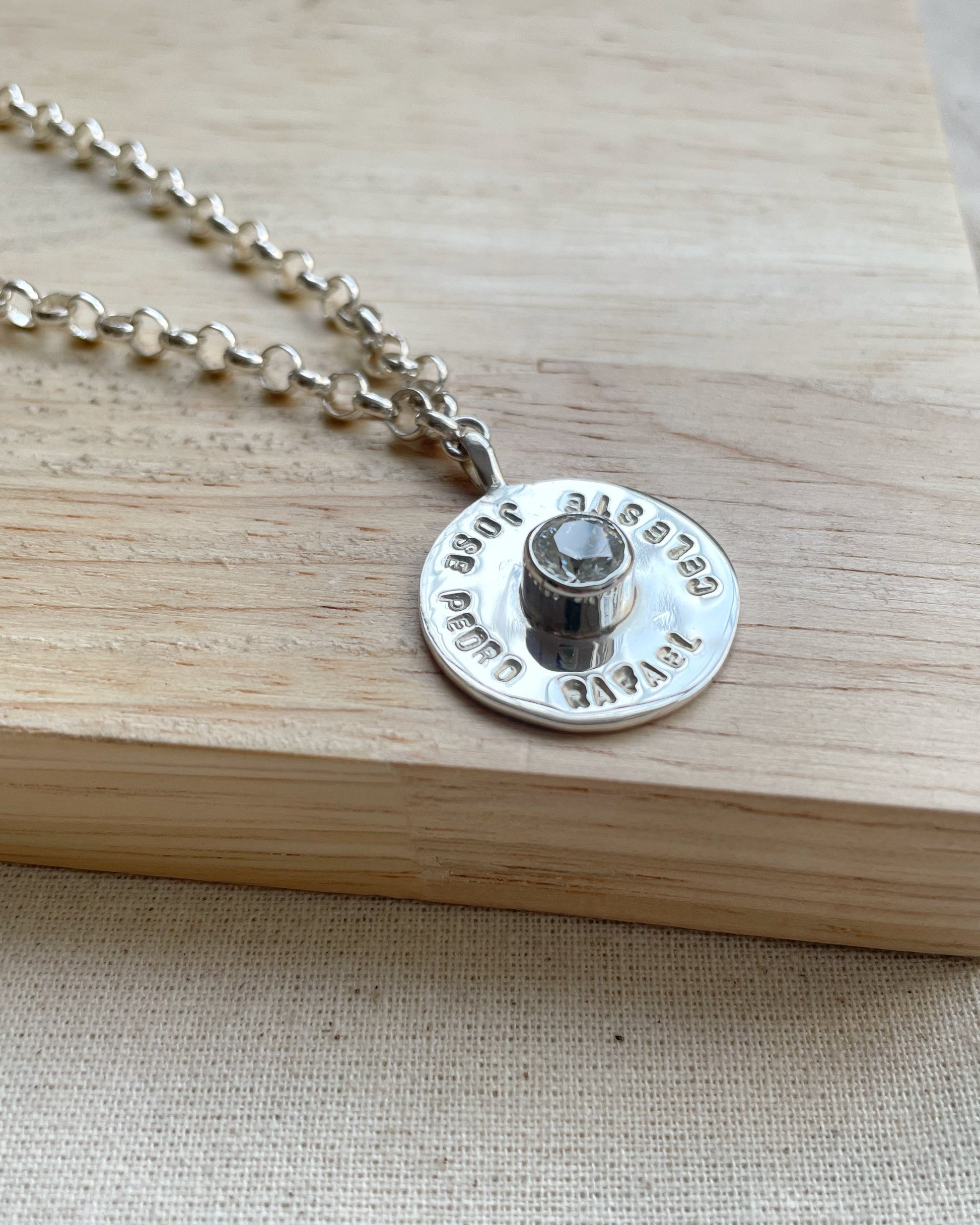 Por eso creamos esta medalla: hecha a mano en plata 950, con una piedra central de 6 mm que ilumina cada recuerdo.