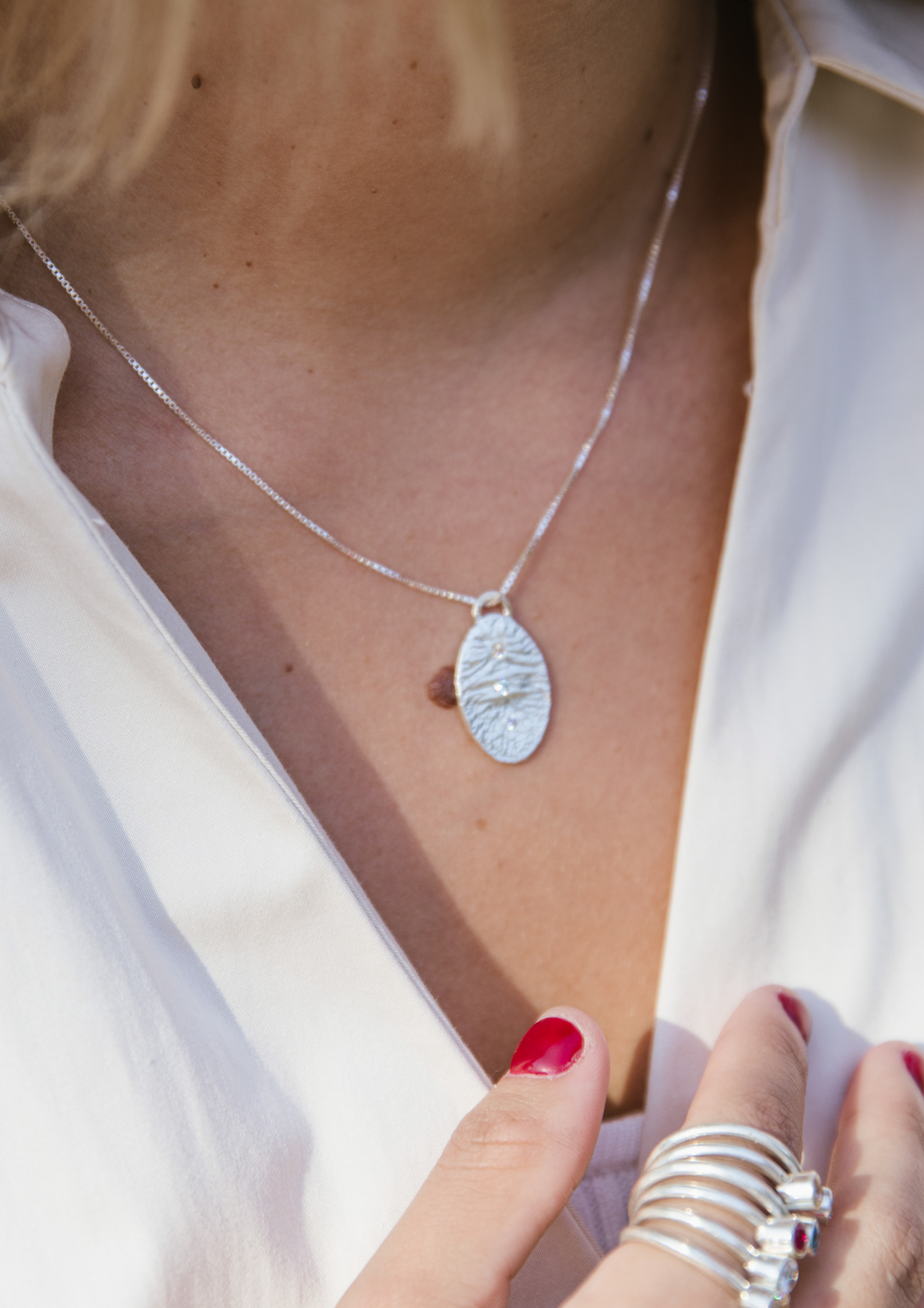 ¡Enamórate de este collar! Este collar con colgante ovalado de plata reticulada y 3 circones es la pieza perfecta para realzar tu belleza natural. Elegante y versátil, combina la belleza del metal precioso con el brillo radiante de los circones.
