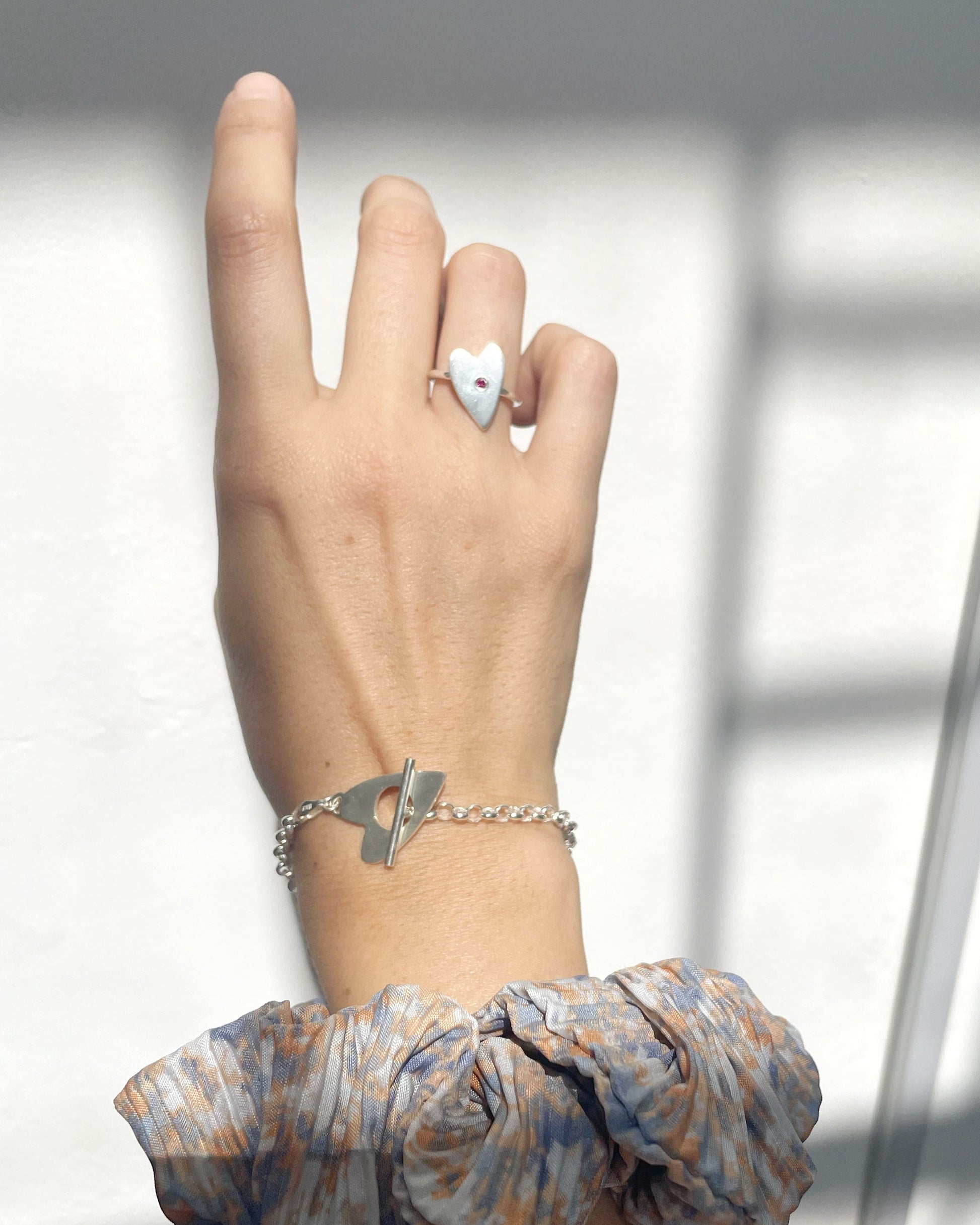 El diseño se completa con un broche de palito, una pieza moderna y funcional que asegura un ajuste cómodo. Con un largo total de 19 cm, esta pulsera se adapta perfectamente a la muñeca, siendo una opción versátil tanto para el Día del Amor como para todos los días.